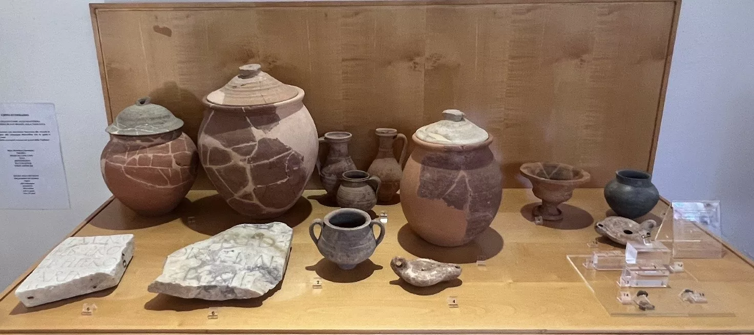 Oggetti come manufatti in ceramica, vasi di grandi e medie dimensioni, recipienti più piccoli, una coppa a calice, frammenti di iscrizioni in pietra e gioielli, fanno parte del corredo ritrovato nella tomba della Celiaca, risalente all’epoca romana.
