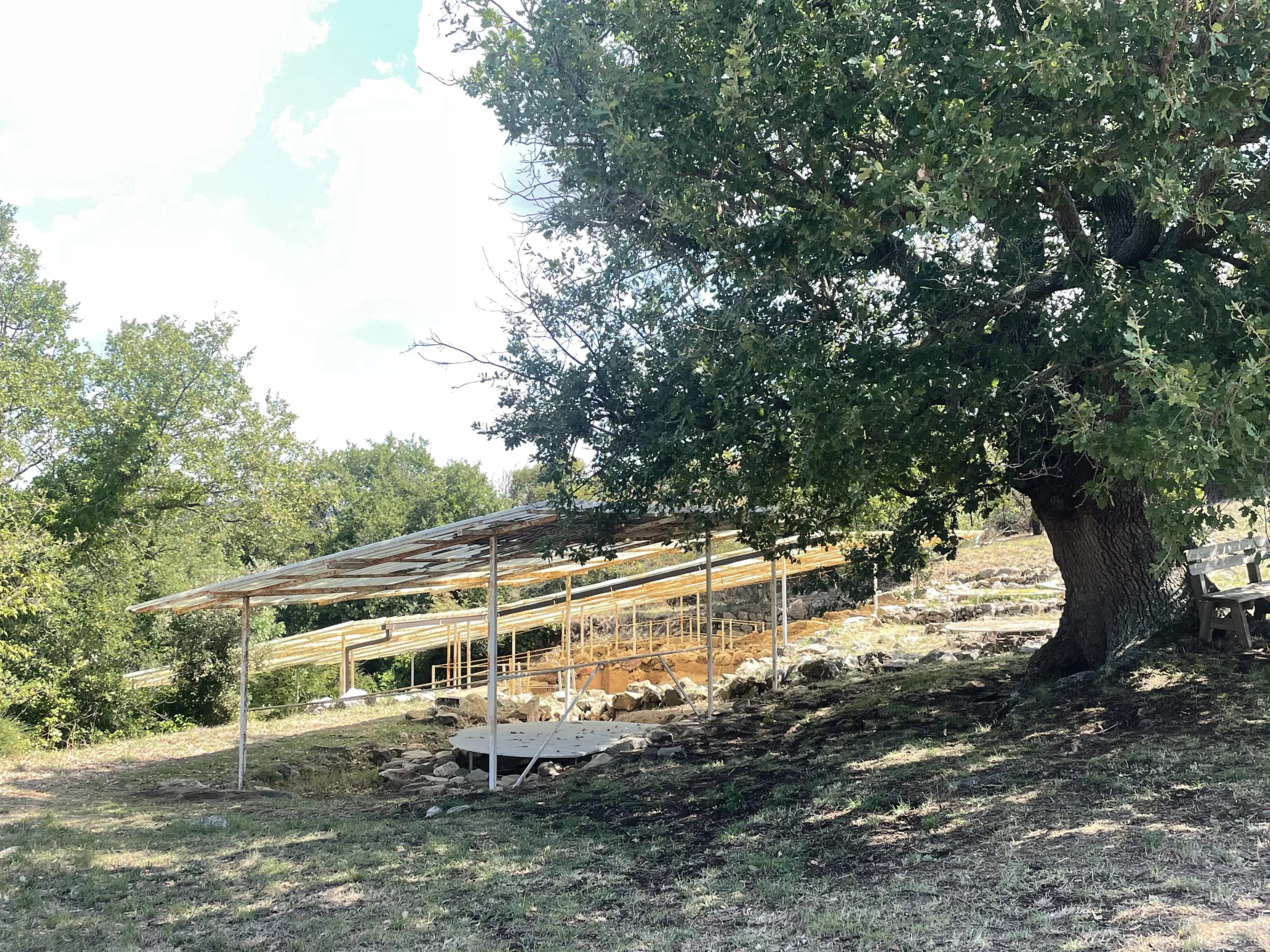 Superata la cisterna, si raggiunge un quartiere abitativo ellenistico impostato su terrazze scavate nella roccia e servito da una strada acciottolata. Le case, con muri a secco intonacati e pavimenti in cocciopesto, erano attraversate da una fitta rete di canalizzazioni. Sotto questo livello si conservano strutture arcaico-classiche, tra cui un’abitazione a due vani e forni per la cottura della ceramica, costruiti con piccole pietre e rivestiti internamente d’argilla. L’insieme suggerisce che nell’età arcaica l’area ospitasse un quartiere artigianale, favorito dalla posizione ventilata sul versante settentrionale.