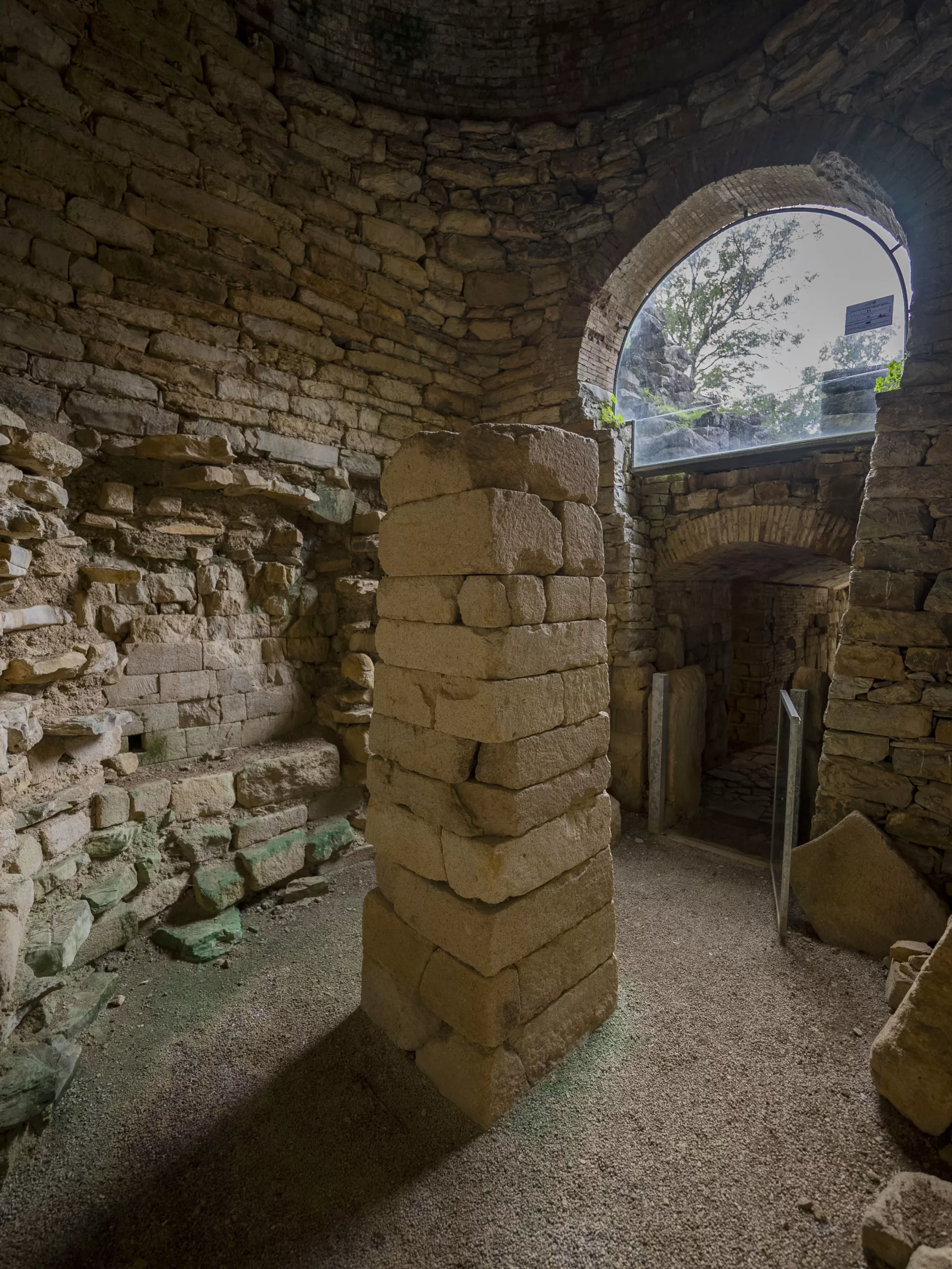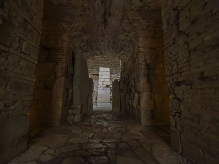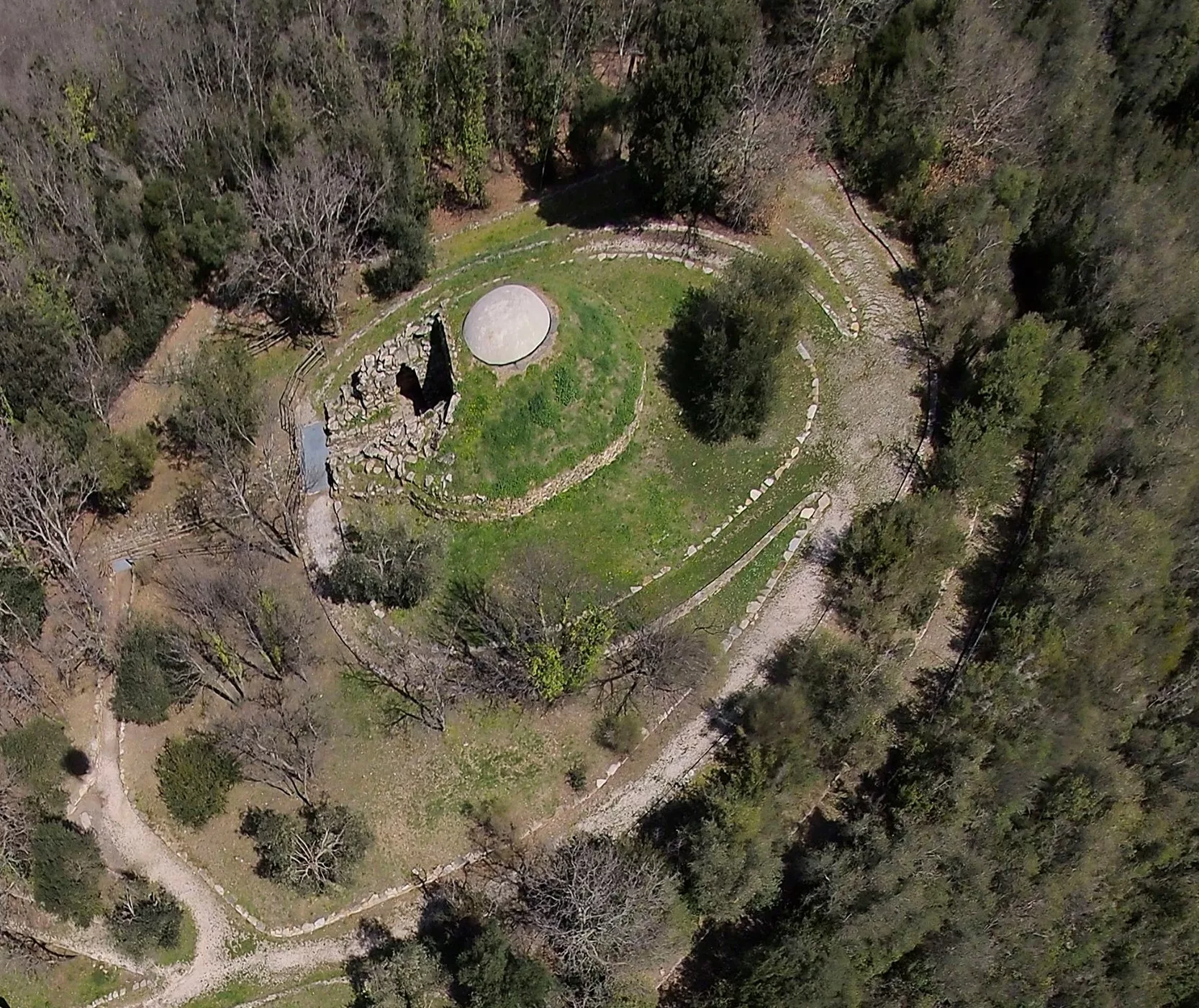 Il tumulo, un tempo circondato da un tamburo oggi perduto e sostituito da muretti a secco, racchiude al suo interno una camera funeraria a tholos, caratterizzata da una pseudocupola ottenuta mediante l’aggetto progressivo di filari di pietra. La particolarità di questo ambiente consiste nella sovrapposizione di ben due camere funerarie: la prima, a pianta circolare, costruita nel terzo quarto del settimo sec. a.C., crollò probabilmente già durante o subito dopo la sua costruzione, forse per l’utilizzo di materiali non idonei. Su di essa fu perciò edificata una seconda camera, a pianta quadrangolare, provvista di pilastro centrale e di un lungo dromos, un corridoio di accesso a cielo aperto, alle cui pareti si aprivano due piccole celle contrapposte, che ancora oggi è possibile ammirare.
